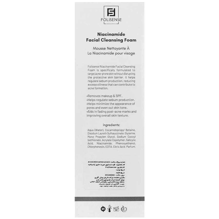 فوم شستشوی صورت نیاسین آمید فولی سنس، پاک کننده آلودگی ها و مواد آرایشی پوست دارای اثر ضد التهاب و کاهش دهنده قرمزی، تورم و کاهش آثار جوش و آکنه فوم شستشو صورت نیاسینامید فولی سنس، کنترل کننده ترشح چربی پوست قابل استفاده برای انواع پوست مخصوصا پوست چرب و مستعد آکنه فوم شستشو صورت فولی سنس حاوی نیاسینامید، یکنواخت کننده رنگ پوست حاوی نیاسینامید به منظور جلوگیری از تشکیل جوش و آکنه موثر در کاهش انداره منافذ باز پوست